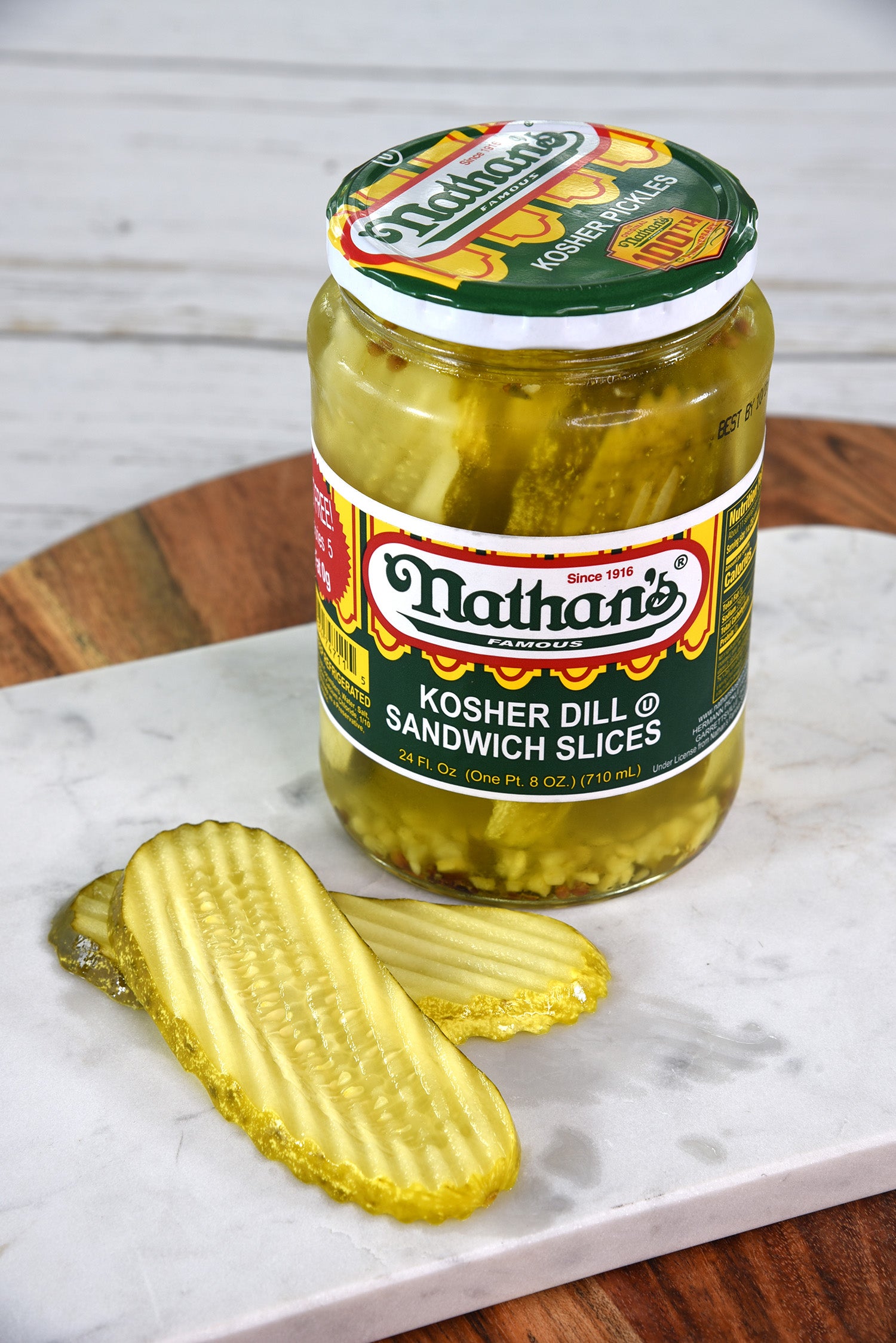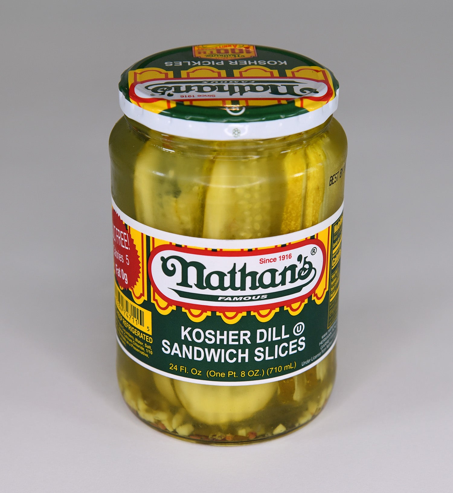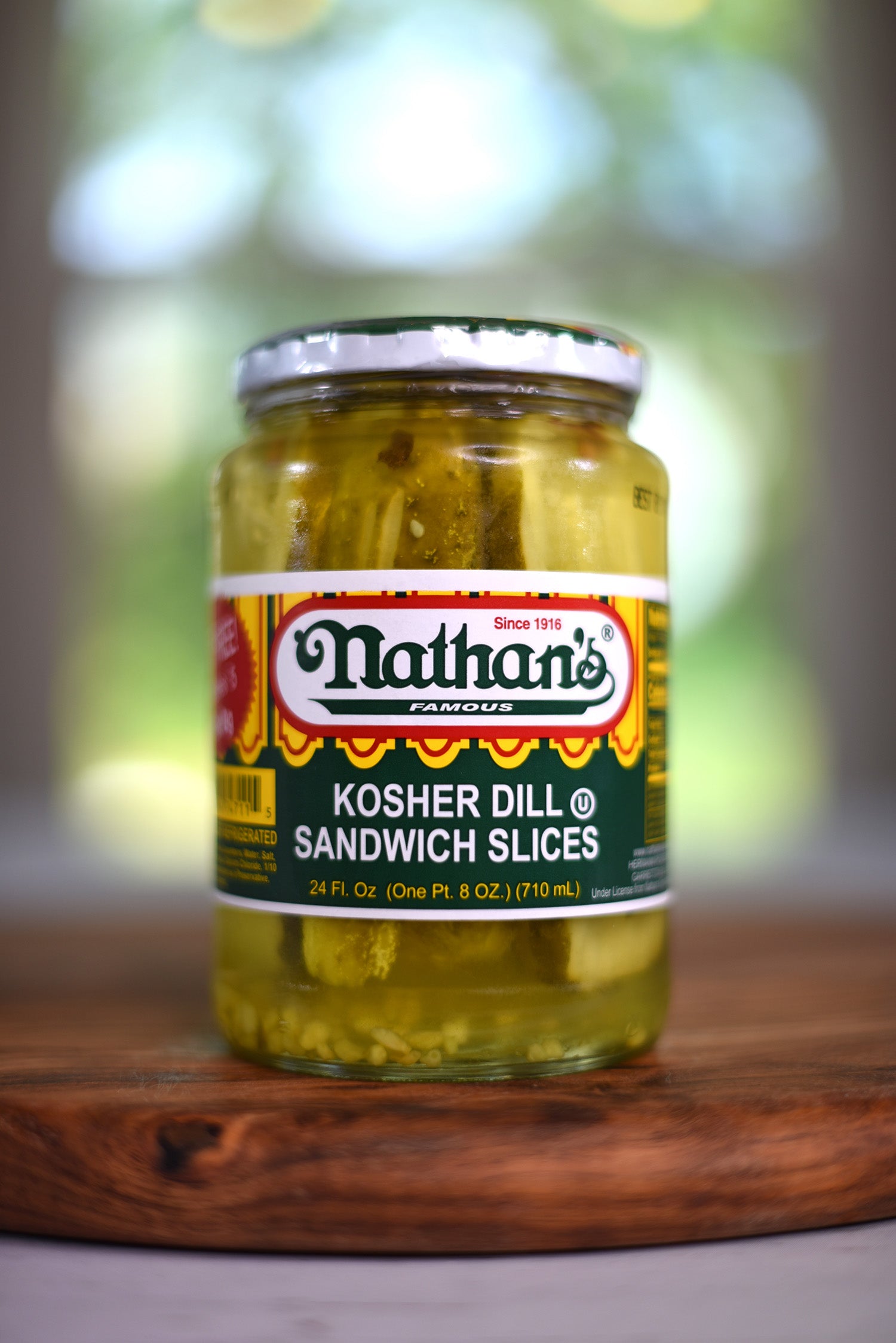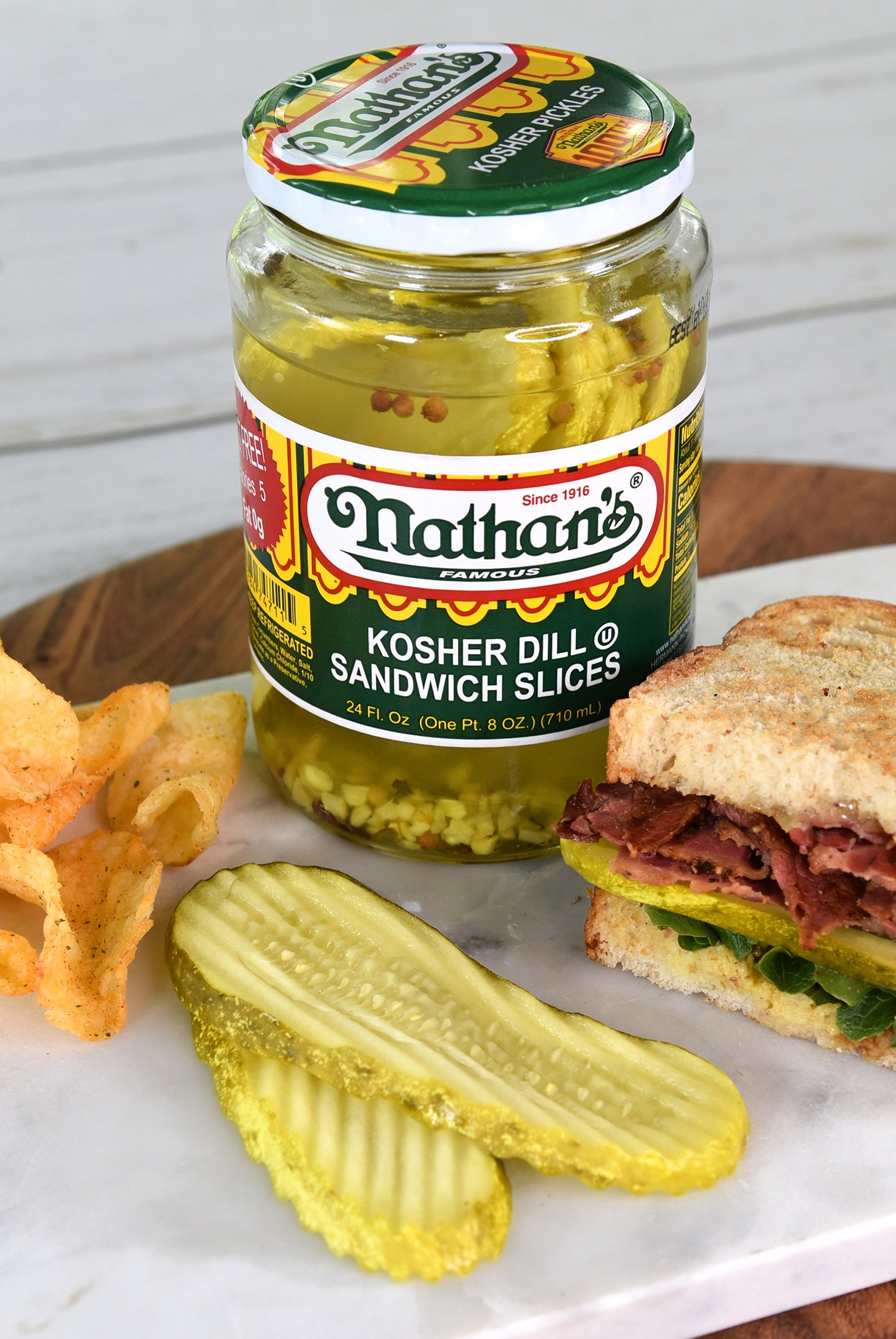 Nathan's Famous Kosher Dill Sandwich Slices deliver a well-balanced combination of classic dill flavor, tanginess, crispness, and subtle garlic and herbaceous notes. Renowned for their crispness, Nathan's Famous Kosher Dill Sandwich Slices provide a satisfying crunch that elevates the texture of your sandwiches and dishes. These pickle slices exhibit subtle hints of garlic, contributing to the depth and complexity of their overall flavor profile. Infused with fresh dill and traditional pickling spices, the pickles offer an herbal complexity that adds a nuanced and multidimensional taste. Enjoy the classic and zesty delight of Nathan's Famous Kosher Dill Sandwich Slices for a delicious, timeless taste sensation.