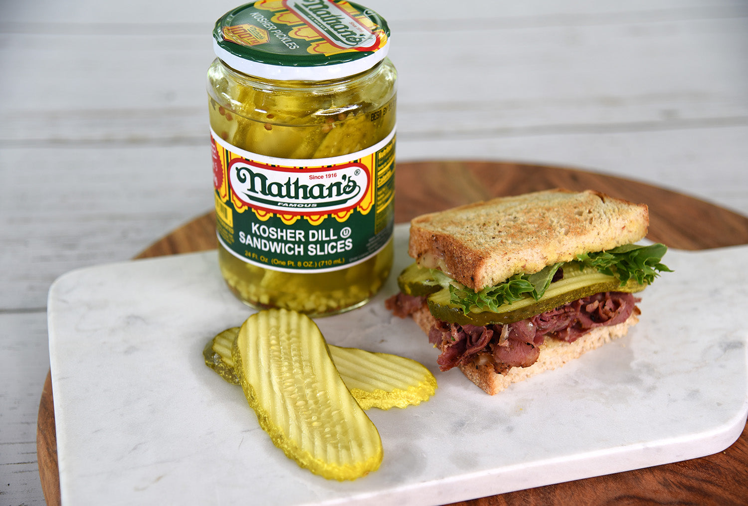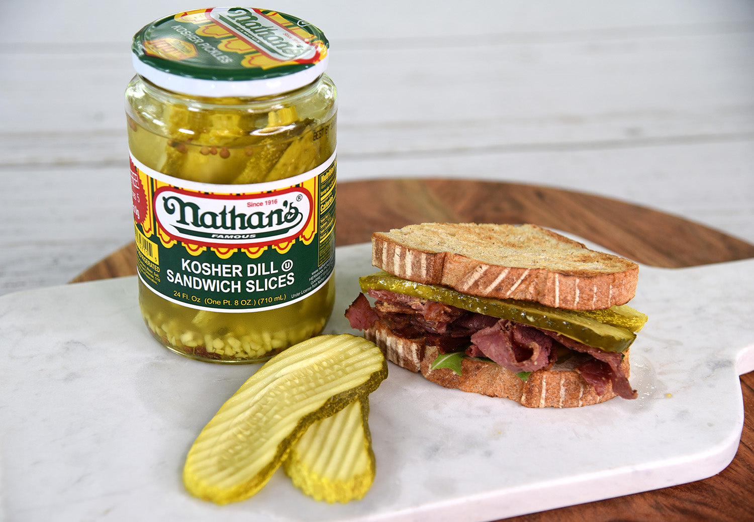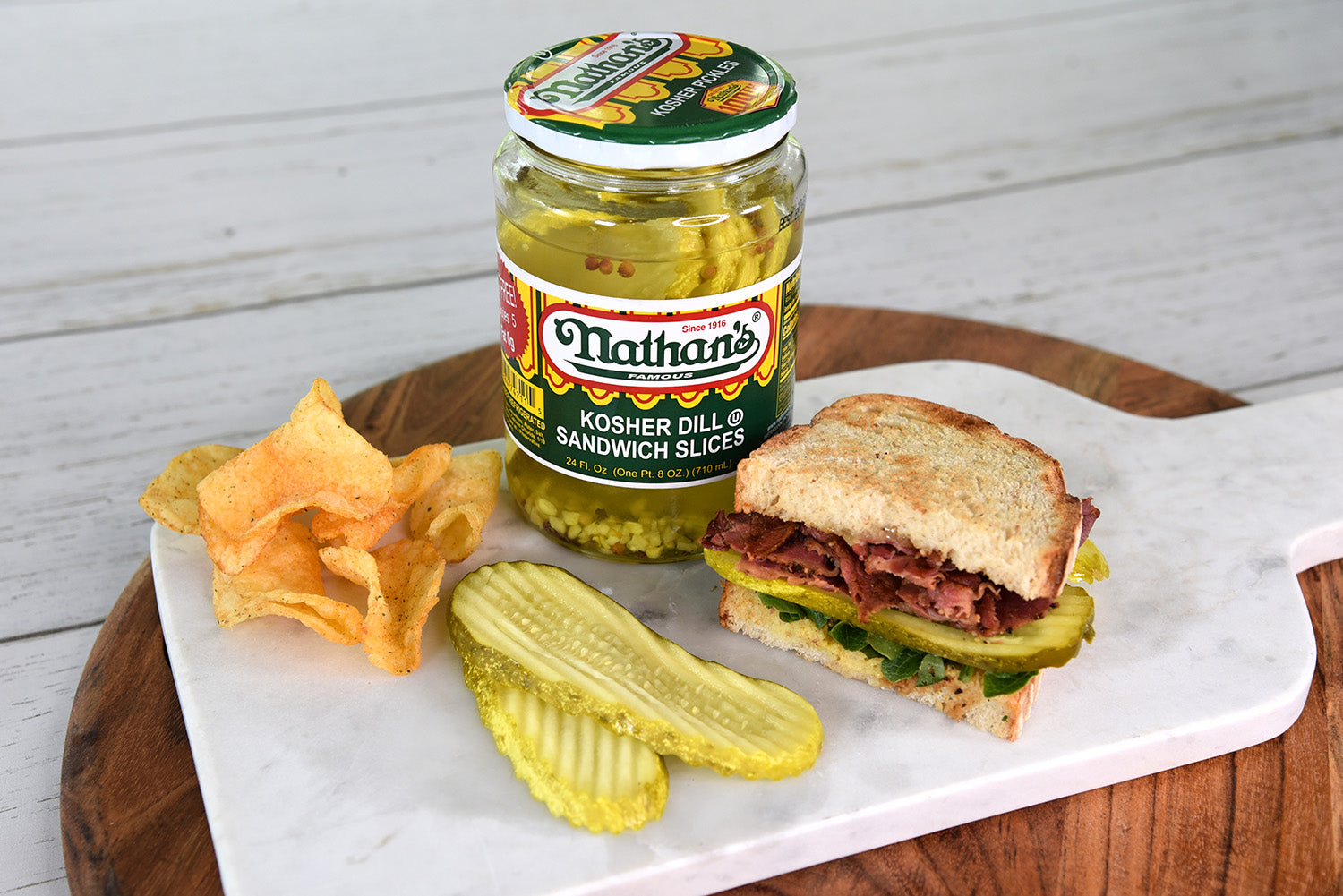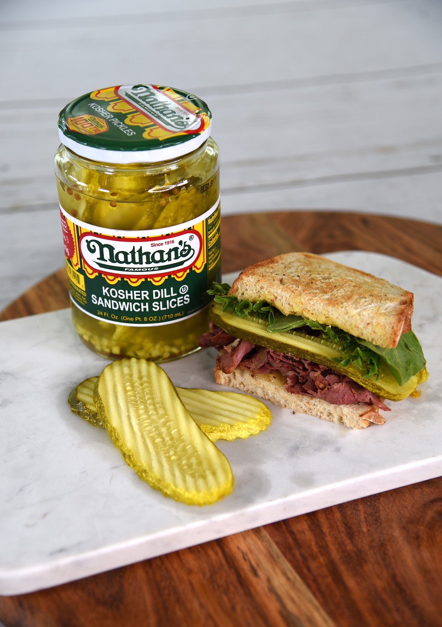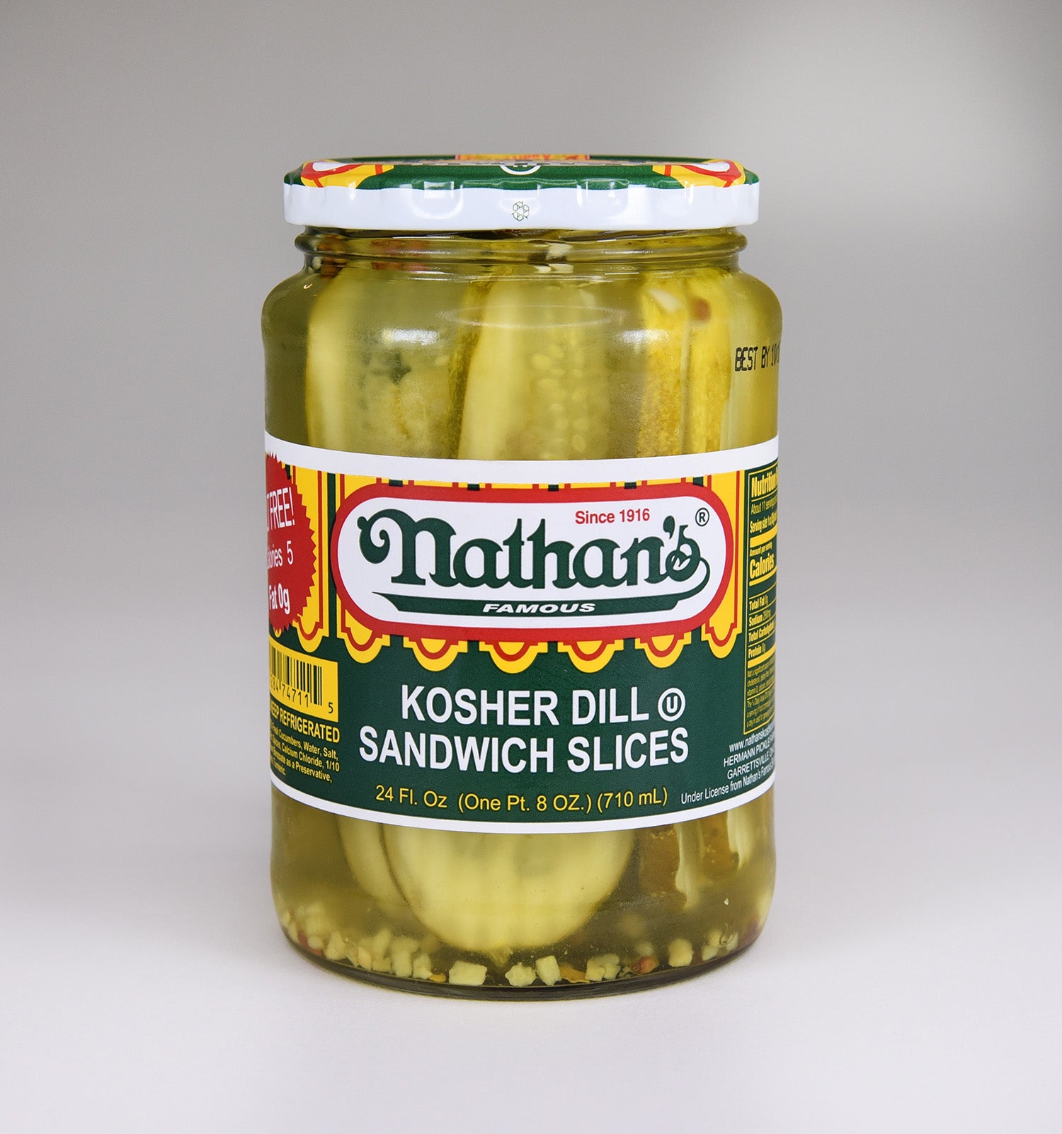Nathan's Famous Kosher Dill Sandwich Slices deliver a well-balanced combination of classic dill flavor, tanginess, crispness, and subtle garlic and herbaceous notes. Renowned for their crispness, Nathan's Famous Kosher Dill Sandwich Slices provide a satisfying crunch that elevates the texture of your sandwiches and dishes. These pickle slices exhibit subtle hints of garlic, contributing to the depth and complexity of their overall flavor profile. Infused with fresh dill and traditional pickling spices, the pickles offer an herbal complexity that adds a nuanced and multidimensional taste. Enjoy the classic and zesty delight of Nathan's Famous Kosher Dill Sandwich Slices for a delicious, timeless taste sensation.