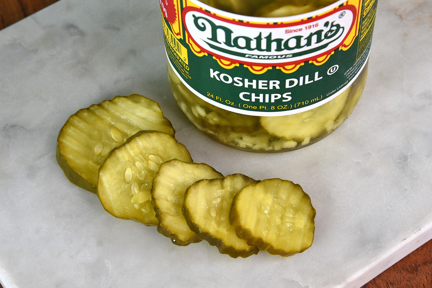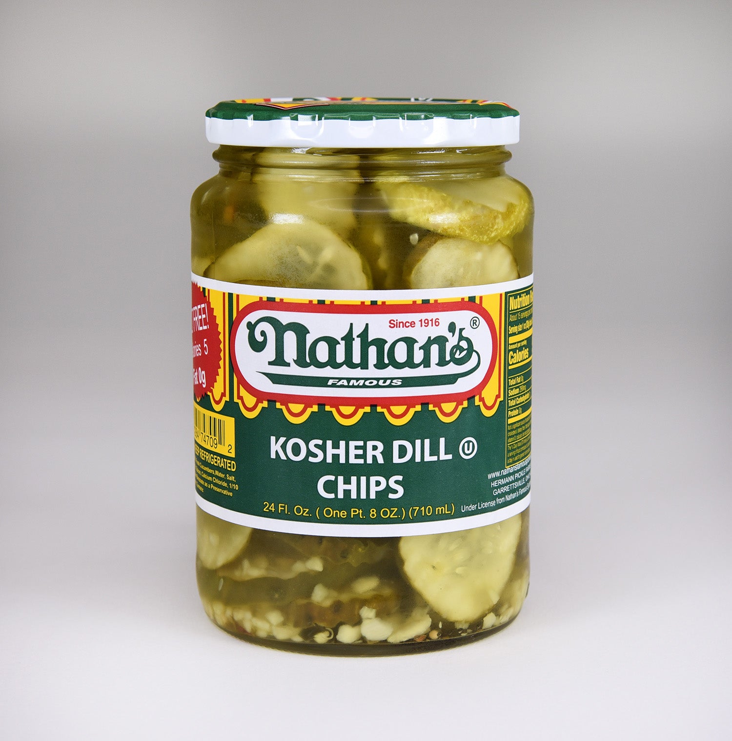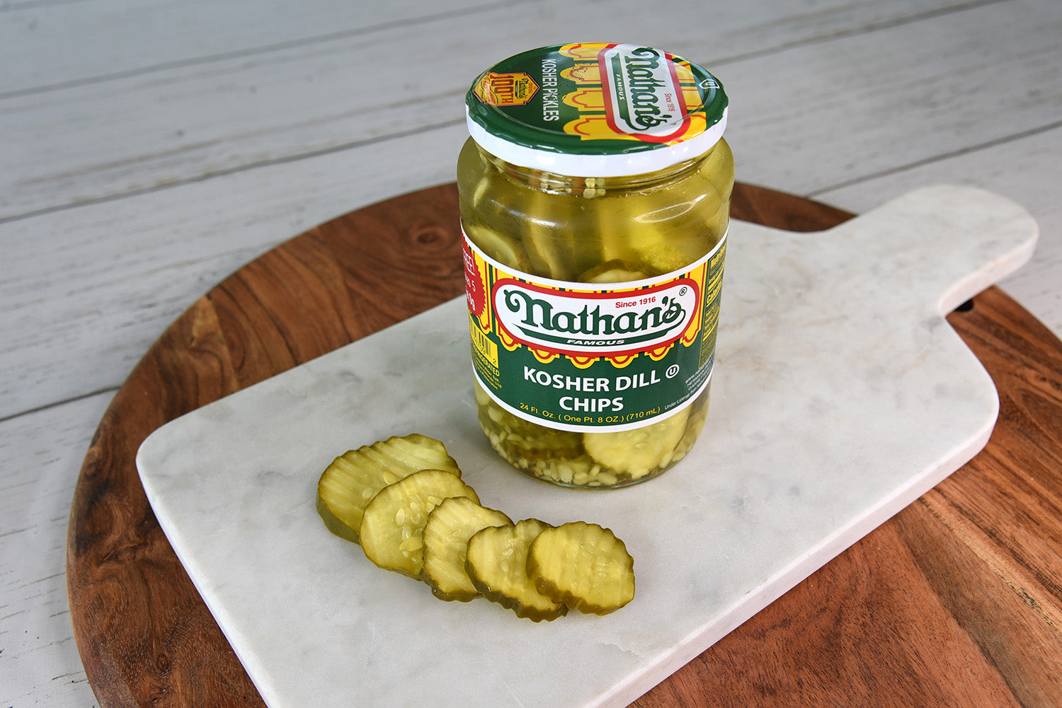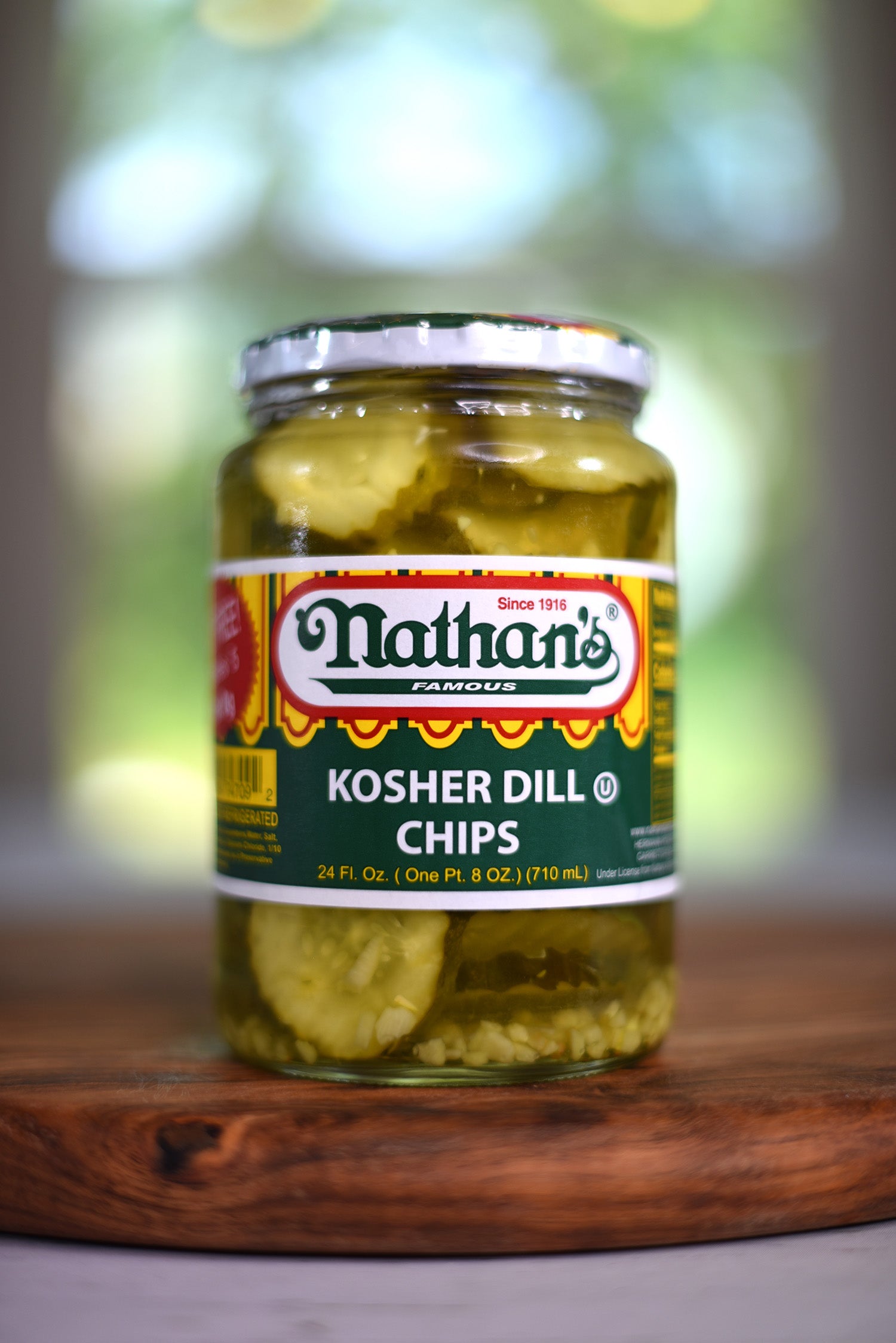 Nathan's Famous Kosher Dill Pickle Chips provide a delicious and classic dill pickle experience, boasting a balance of tanginess, earthiness, and crispness.